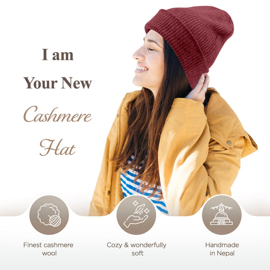 Kaschmirmütze Beanie gerippt mit Umschlag - Dunkelrot