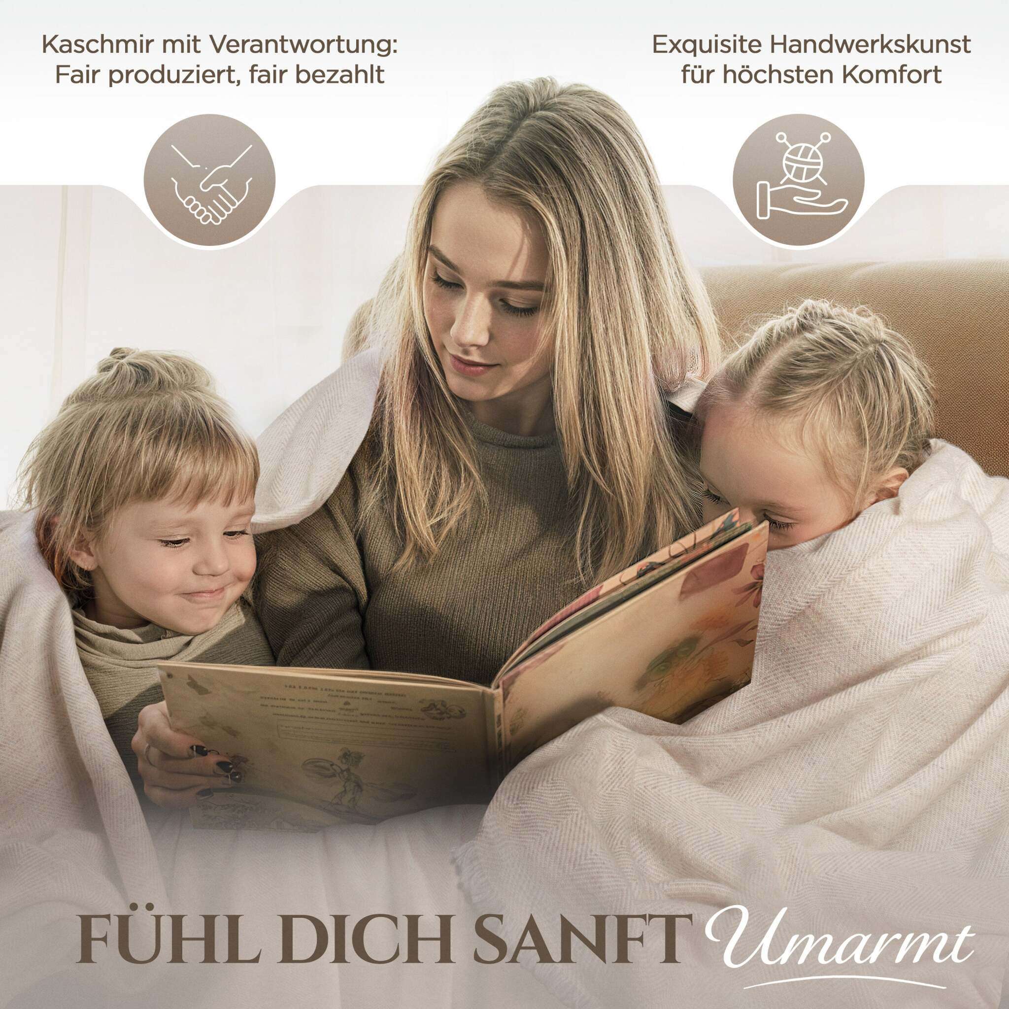Zwei Hände halten eine beige Kaschmirdecke mit feinem Fischgrätenmuster vor unscharfem, grünlichem Hintergrund im Freien. Oben steht Text „Jedes Stück ein Unikat, erlesene Handarbeit aus Nepal“. Unten sind vier runde Symbole mit Beschreibungen: eine Feder mit „Wunderbar weich“, ein gefaltetes Tuch mit „Leicht & schön warm“, ein atmungsaktives Textil mit „Atmungsaktives Naturprodukt“ sowie ein Baby mit „Auch für Babies geeignet“. Die Decke wirkt zart, weich und hochwertig verarbeitet.