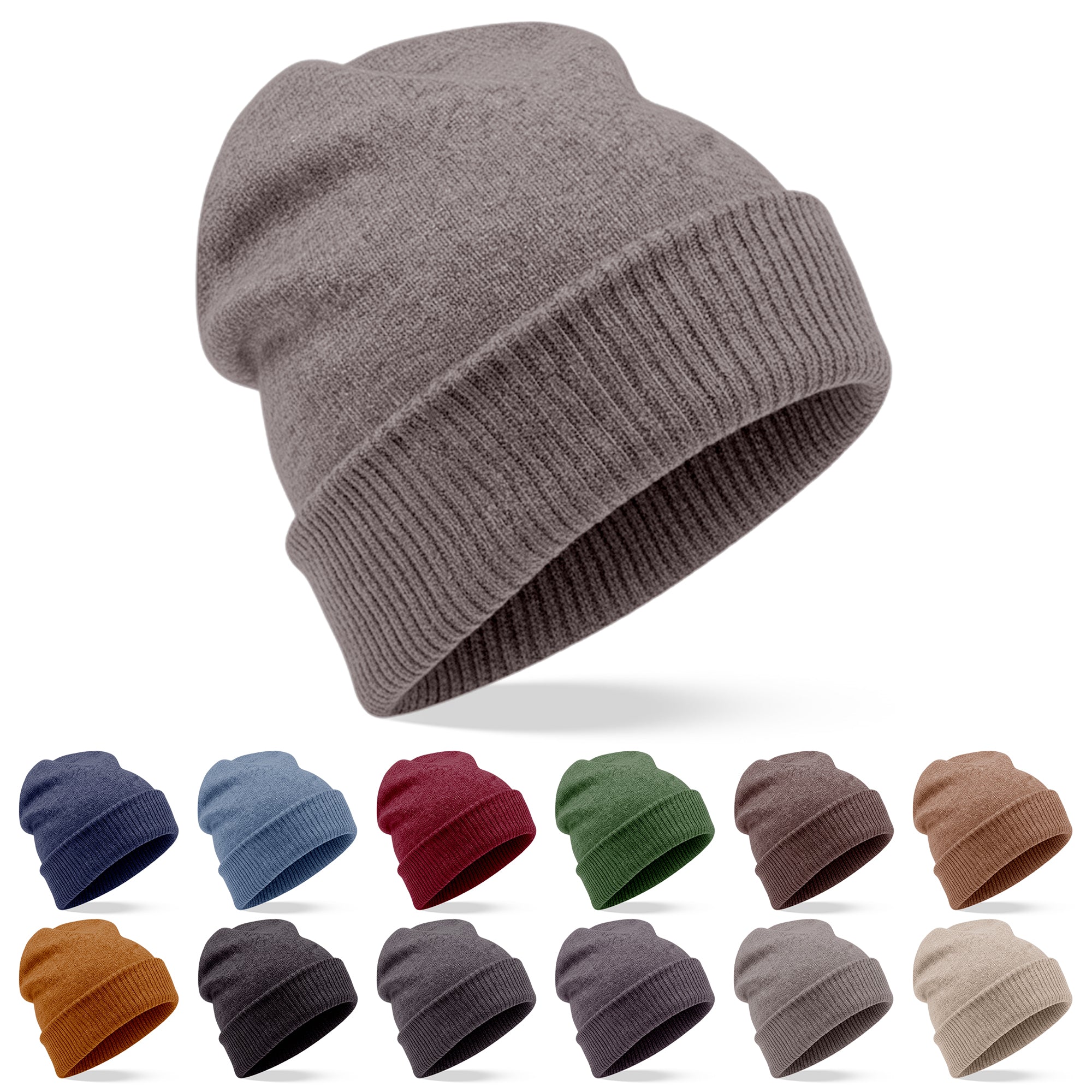 Kaschmirmütze Beanie glatt mit geripptem Umschlag Grau
